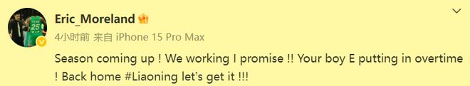 莫兰德还承诺,自己会更加努力地投入到训练中,很想和辽篮的兄弟们一道,再次向CBA总冠军发起冲击。
