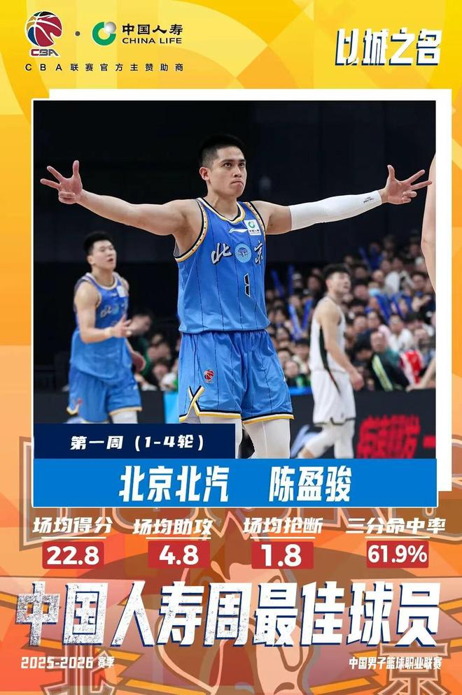 北京时间12月22日,CBA联赛官方宣布首钢后卫陈盈骏当选CBA第一周周最佳球员。