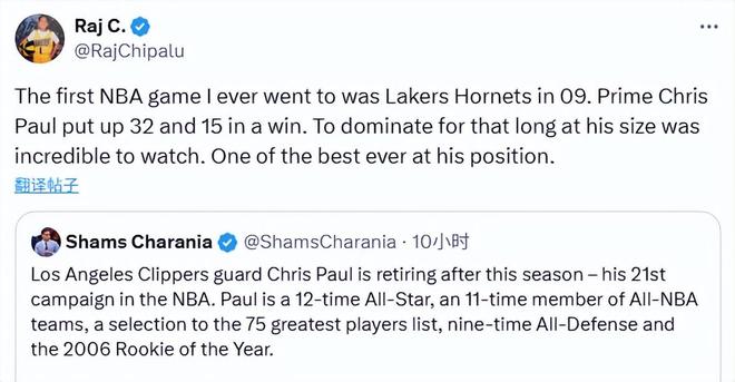 面对这名老将的退役,快船记者Jamal Cristopher发文称赞道:“他是篮球史上最伟大的球员之一,以他这样的身材达到这样的高度,能够与CP3真是我的荣幸。”