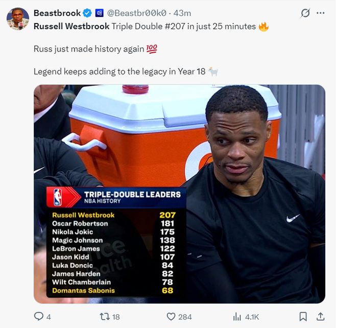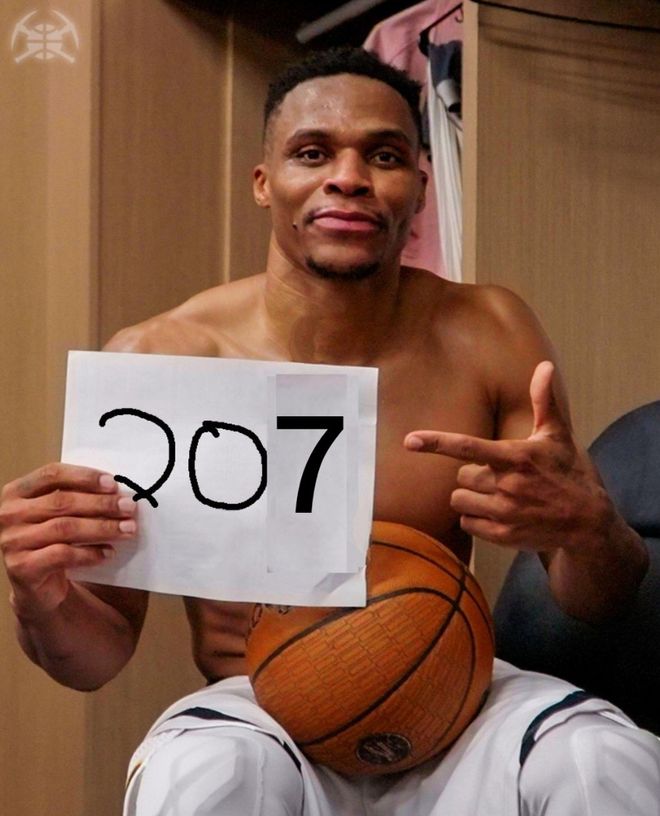 207次三双吞里程悲!底薪威少反超约基奇登顶队记:感谢37岁老将
