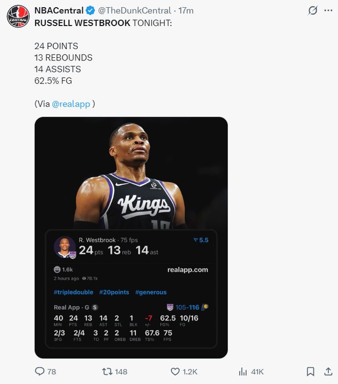 国王队官方也晒出推文祝贺拉塞尔-威斯布鲁克完成自己新的生涯里程碑。