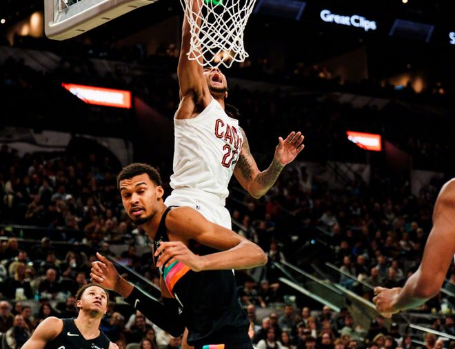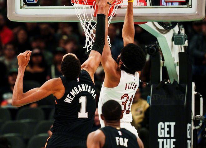 本场比赛有意思了,两队都祭出最强阵容,文班亚马和上一场打爵士一样,还是首发,回顾下比赛,开场莫布里补篮+阿伦扣篮,文班亚马抛投+跟进双手暴扣泄愤!双方僵持了几分钟,韦德下三分雨打停马刺!中段阿伦连续强攻篮下,亨特续上3+1,骑士已经拉开10分分差。后半段尚帕尼和约翰逊带领马刺追分,文班亚马造杀伤+骑马射箭三分球,第一节马刺26-25领先骑士。进入第二节,文班亚马继续大帽莫布里+突破造杀伤,米切尔和汤姆林下起三分雨,阿伦继续篮下肆虐,福克斯则内突外投咬住比分。
