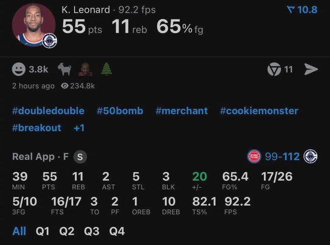 快船五连胜期间,伦纳德毫无疑问是最大功臣,期间场均爆砍37.8分8.6板4.2助2.8断神级数据,攻防两端都展现出了极其强悍的统治力,可谓是神挡杀神佛挡杀佛,现在对手光是碰见他就尿不湿都湿了。
