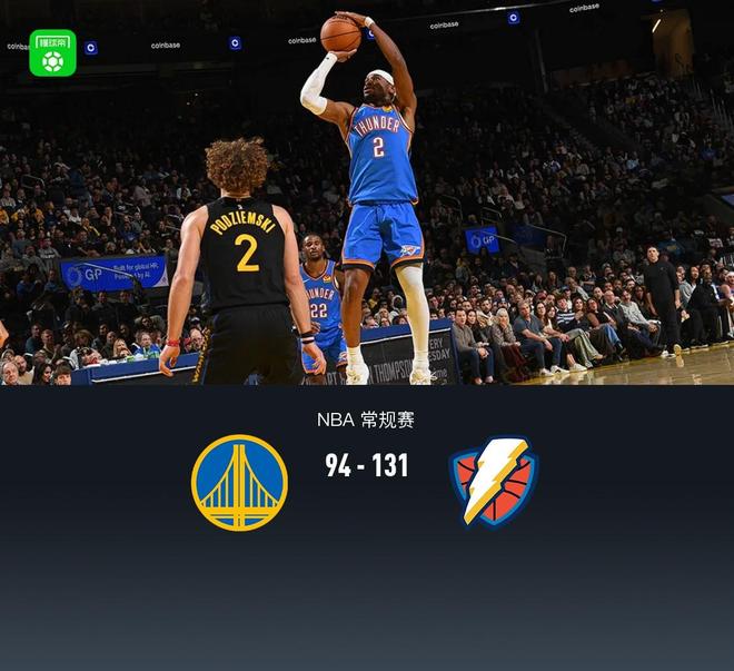 第四节,雷霆直接收兵换下主力,进入到练兵时间,分差始终维持30分上下,比赛收尾段雷霆最大领先41分,全场结束,雷霆131-94勇士。