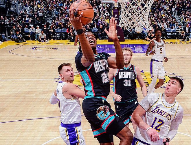拉拉维亚三分球止血后,灰熊的波普和斯莫尔继续上分,东契奇回来后和斯玛特一起又开始造犯规,灰熊打得气势如虹,拉拉维亚三分球杯水车薪,节末东契奇联合老詹强攻,拉拉维亚手感不错,湖人总算匹配了对手节奏,半场54-65落后灰熊,湖人21次罚球,但篮板球比对手少了11个。进入下半场,拉拉维亚续上三分,GG杰克逊暴扣+上篮,湖人内线形同虚设。中段艾顿联合拉拉维亚打出小高潮,追到只差5分,韦尔斯和阿尔达马又挺身而出,双方陷入拉锯战。后半段小贾伦带队拉开分差,东契奇罚球+三分球追分,老詹也续上三分。