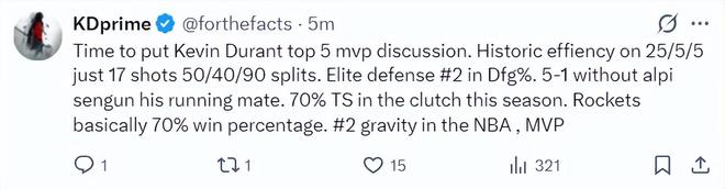 5.是时候将杜兰特纳入MVP讨论了,他的命中率依旧在50/40/90左右,他的限制对手命中率联盟第二出色。防守篮板率也是联盟前列,在没有申京的情况下他带队5胜1负,决胜时刻的出手命中率高达70%,他应该是联盟前二的超巨,也是MVP候选人。