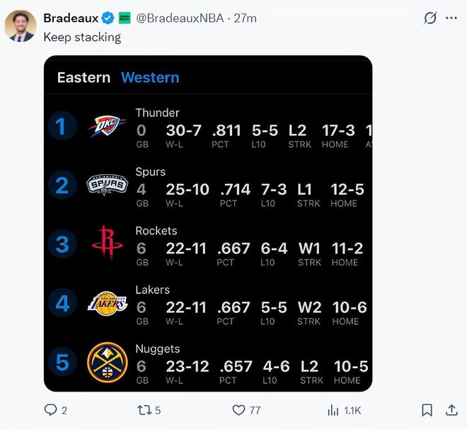 这场比赛后火箭队已经升至西部第三,火箭距离西部第二的马刺只剩下两个胜场差而已。