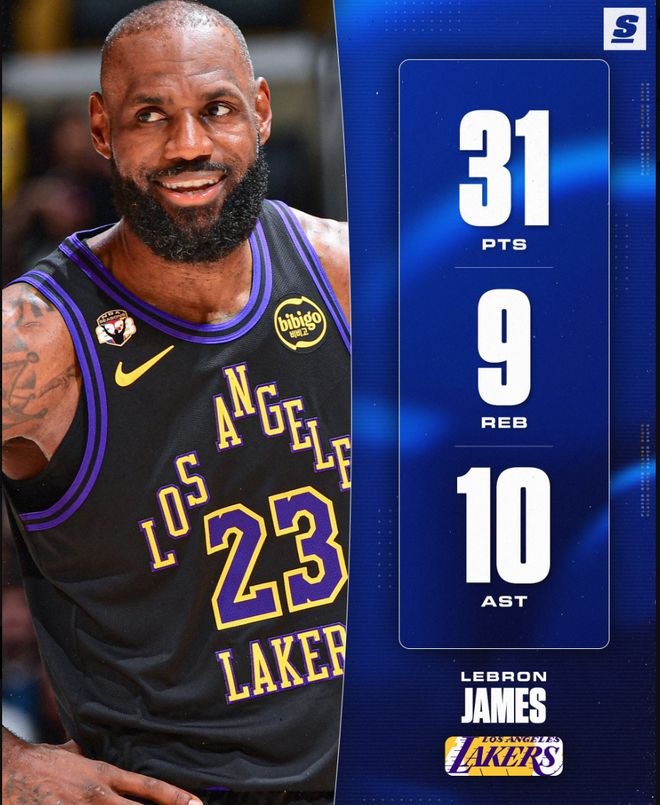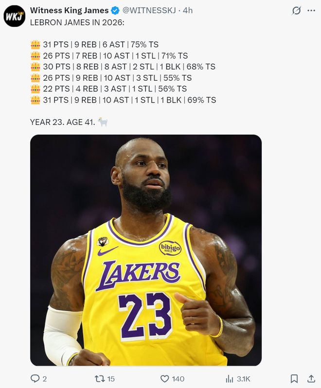 湖人媒体晒出2026年詹姆斯的数据后写道:这是进入23个赛季+年满41岁的勒布朗,他就是GOAT。