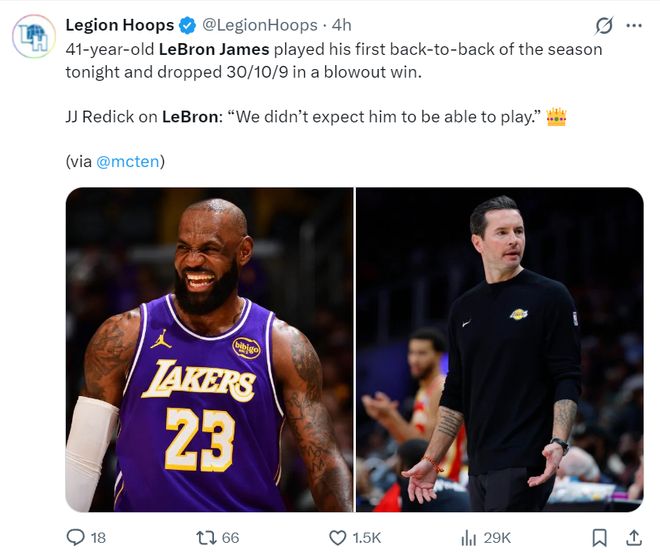 赛后湖人主帅雷迪克谈到詹姆斯31+10+9的数据:这场比赛我都没有料到勒布朗会登场,因为这是背靠背的第二场,41岁的勒布朗对比赛的投入程度超过了任何人。