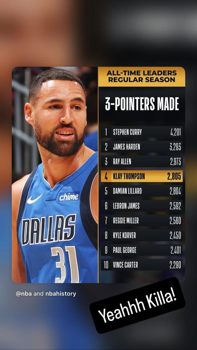 赛后,库里在个人社交媒体向克莱表示了祝贺,他晒出了昔日队友克莱的三分数据,并配文写道:“耶,杀手!”