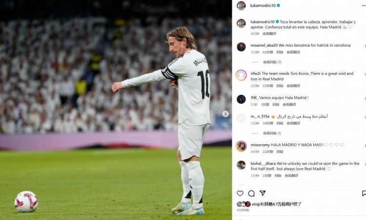10月28日报道 西甲第11轮比赛,皇马主场0-4不敌巴萨,目前莫德里奇更新社媒,鼓励了皇马。