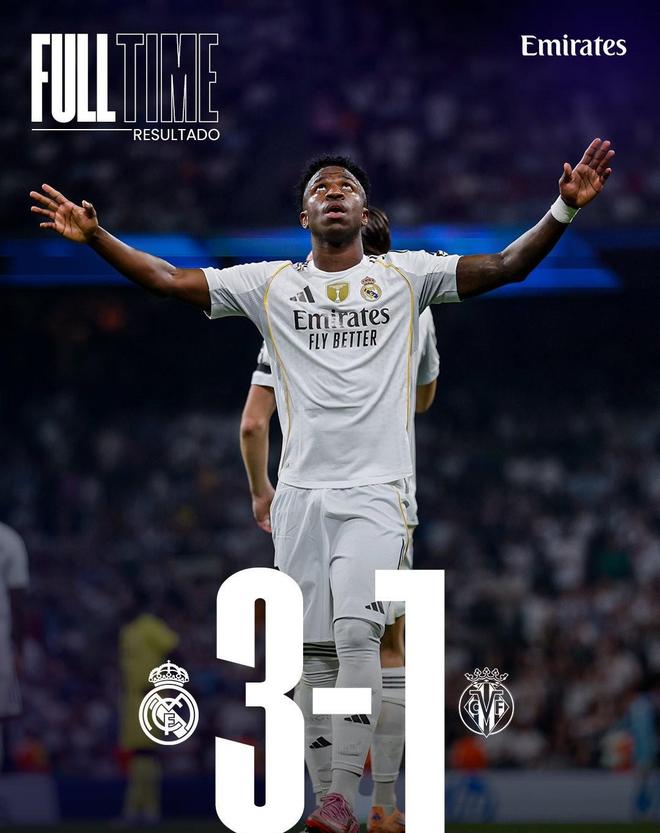 2025年10月5日凌晨,西甲第8轮,皇家马德里在主场伯纳乌球场以3-1战胜比利亚雷亚尔,凭借维尼修斯的梅开二度和姆巴佩的进球,球队豪取各项赛事主场八连胜,并以21分(8战7胜1负)暂时登顶积分榜,领先少赛一场的巴塞罗那2分。