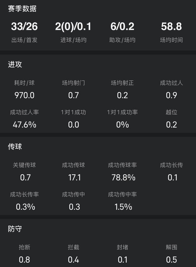 24/25赛季的西甲联赛中,朱利亚诺·西蒙尼作为老父亲的头号边路主力人选出战33次,打入2球送出6次助攻,场均有0.9次过人,成功率达到47.6%。除此之外,朱利亚诺场均有0.8次抢断、0.4次拦截和0.5次解围,是马竞铁血防守的第一道防线。