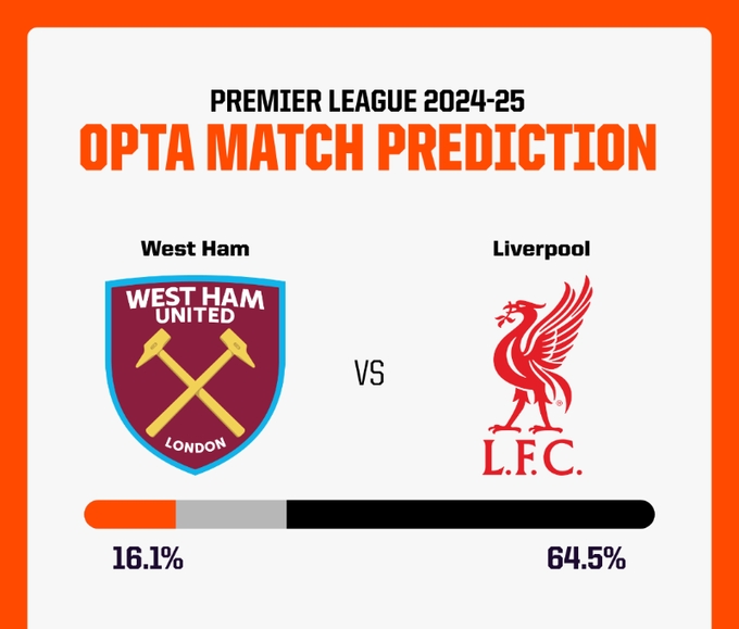 延续连胜opta超算预测利物浦战胜西汉姆概率64.5%,输球16.1%