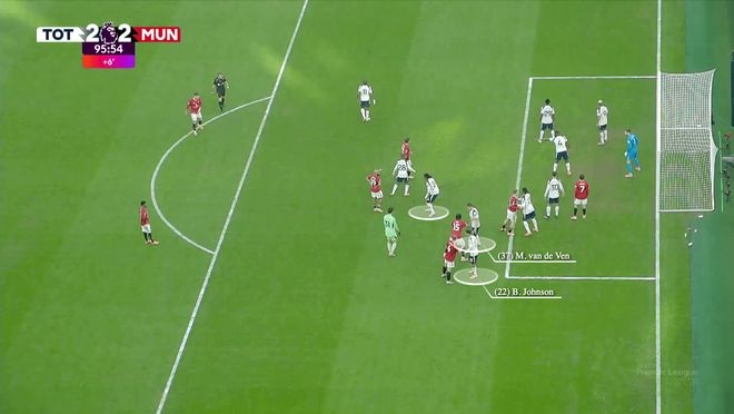 一旦曼联队长开出角球,德利赫特改变方向冲向后点,约罗移向中央区域,芒特则卡在了热刺门将维卡里奥的身前。