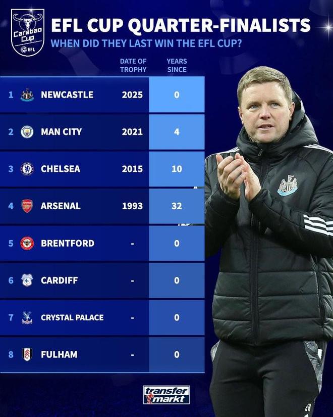 英联杯四分之一决赛将于本周打响,在此之际,德国转会市场列出了本赛季八强距离上次夺冠时间的榜单。本赛季英联杯八强距上次夺冠时间:1、纽卡 上次夺冠是2025年 距上次夺冠0年2