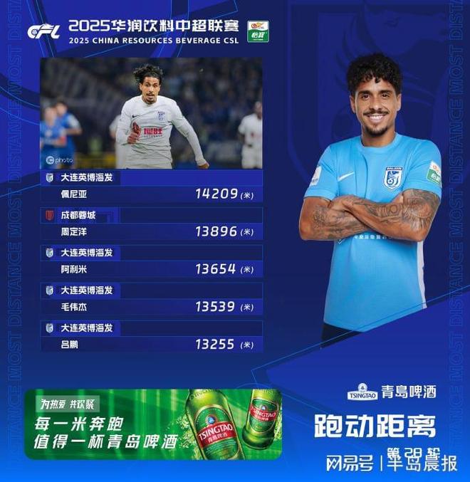 本轮联赛中,阿利米第六次上榜,以13654米的跑动距离排在第三位。领跑的是队友佩尼亚,跑动距离高达14209米,不仅刷新了本赛季跑动榜最长距离纪录,也是本赛季球员单场跑动距离首次突破14000米大关。毛伟杰、吕鹏分列四、五位,跑动距离分别为13539米和13255米。客场挑战整体实力更强的申花,英博能够在比赛的多数时间内处于领先,与球员们不知疲倦的跑动有着直接关系。