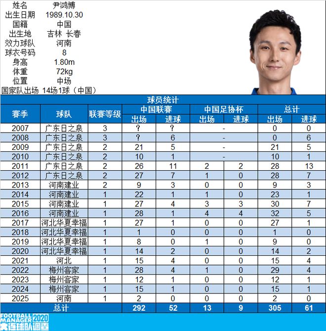 巅峰时期的尹鸿博也是国家队常客,跟随国足征战过世预赛、东亚杯、国际友谊赛。国家队生涯中,他累计出场14次,打进1球,送出6记助攻。